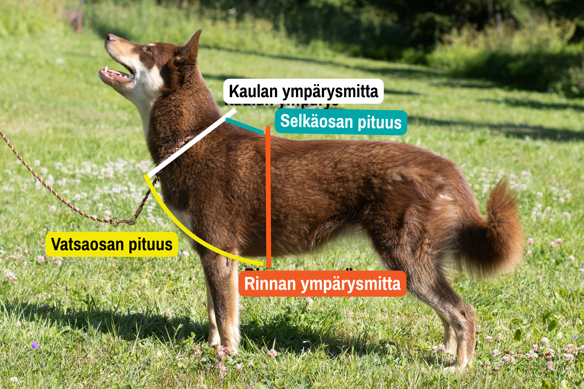 HUOM! Kun tilaat mittatilausvaljaat, Solmu Dogs ei vastaa mahdollisista asiakkaan tekemistä mittavirheistä. Jos tahdot saada parhaat mahdolliset mitat valjaita varten, vieraile Solmu Dogsin myymälässä mittauttamassa koirasi koko tiedot. Ilmoita Kassa-sivun lisätietokentässä mittatilausvaljaita tilatessasi koirasi mitat (kaulanympärys, rinnan ympärys, selkä osan pituus sekä vatsaosan pituus – selkä ja vatsaosan pituus ilmoitetaan sen mukaan, kuinka pitkät haluat näiden olevan valmistettavissa valjaissa. Jos mittatilausvaljaiden tilauksesta on kysyttävää, laita meille sähköpostia: info@solmudogs.fi.
